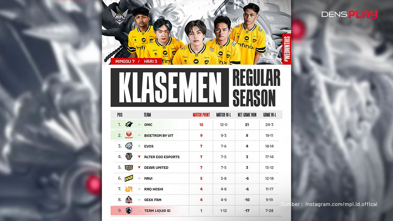 Sejauh ini, Team Liquid ID (TLID) menjadi tim yang sudah dipastikan tidak lolos playoffs. Sementara ONIC dan Bigetron by Vitality sudah mengamankan posisinya terlebih dahulu di babak krusial nanti. Berikut ini hasil klasemen lengkap MPL ID week 7: