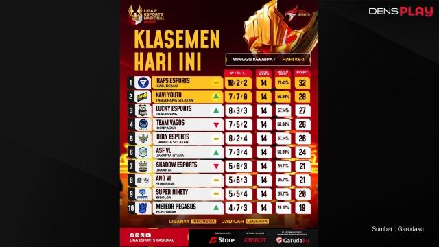 Di posisi kedua, NAVI Youth sukses menang 2-0 atas HFX Esports dan mengantongi 28 poin, disusul Lucky Esports di urutan ketiga dengan 27 poin usai menumbangkan Borneo FC Esports 2-0. Sementara itu, Team Vagos dan Holy Esports sama-sama mengoleksi 26 poin, menjaga peluang promosi mereka tetap ada.