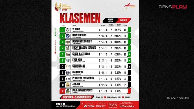 Di posisi kedua, RAPS Esports asal Kabupaten Bekasi masih menjaga peluang setelah bermain imbang 1-1 melawan Pajajaran Esports. RAPS kini mengoleksi 11 poin dari tujuh pertandingan, menunjukkan stabilitas dan kemampuan bertahan yang solid.