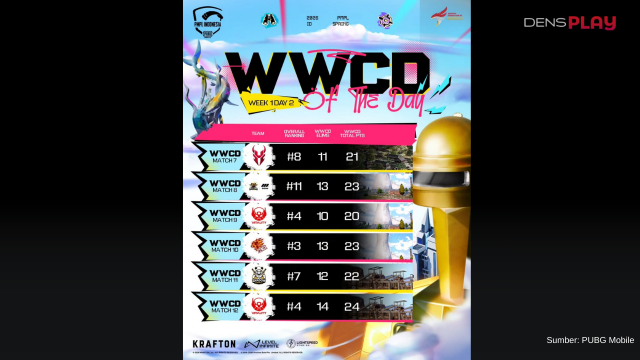 Sementara itu, sejumlah tim lain juga tampil mengesankan dengan mengamankan WWCD di setiap match Day 2. Berdasarkan hasil pertandingan, Zenox ID berhasil meraih WWCD pada Match 7. Setelah itu, Kanzha Underate (KZE) tampil konsisten dengan mengamankan dua WWCD berturut-turut pada Match 8 dan Match 9.