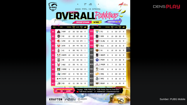 Meski tidak berhasil meraih Winner Winner Chicken Dinner (WWCD) pada match terakhir hari itu, Horboyz Esports tetap kokoh di posisi pertama dengan total 83 poin dari 12 pertandingan. Performa mereka sepanjang Week 2 terbilang sangat dominan, terutama berkat kontribusi 57 eliminasi yang menjadi salah satu faktor utama kuatnya posisi mereka di klasemen tersebut.