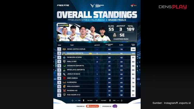 Grand Final Free Fire Nusantara Series (FFNS) SEA 2026 Spring resmi berakhir di PSCC Palembang Icon, Sumatera Selatan, pada Minggu (4/5/2026). Pertandingan malam ini dimenangkan oleh Shadow Esports dengan meraih total 109 poin, 3 Booyah, dan 55 eliminasi.