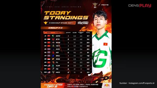 Free Fire World Series (FFWS) SEA 2026 Knockout Stage day 1 resmi dimulai malam ini, Jumat (24/4/2026). Pertandingan pembuka menampilkan persaingan dari Grup A yang diisi HEAVY (HN), Buriram United Esports (TH), GOW Esports (VN), Bigetron by Vitality (ID), WAG (VN), dan Aurora Gaming (MY). Sementara itu, Grup B yakni RRQ Kazu (ID), Maqna Esports Club (MY), All Gamers Global (TH), P Esports (VN), Avida x KDC (TH), serta Team Flash (VN).