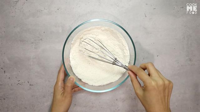 - Masukkan tepung serbaguna, soda kue, garam, baking powder ke dalam mangkuk. Aduk rata