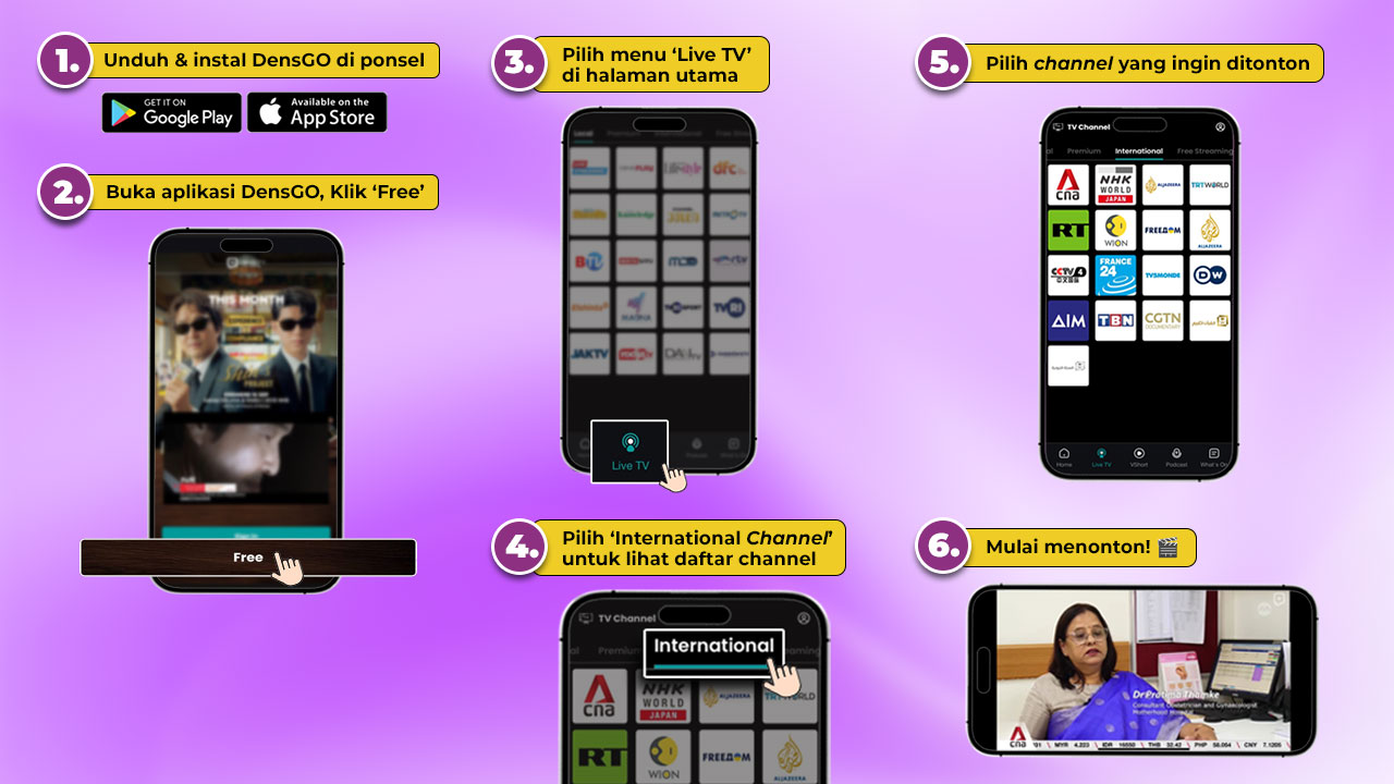 Selain update berita, menonton channel internasional juga dapat memperluas wawasan pelanggan dengan berbagai perspektif, serta meningkatkan kemampuan berbahasa selain bahasa Indonesia. Hanya dengan instal aplikasi DensGO, pelanggan sudah dapat menikmati 17 channel internasional, gratis!