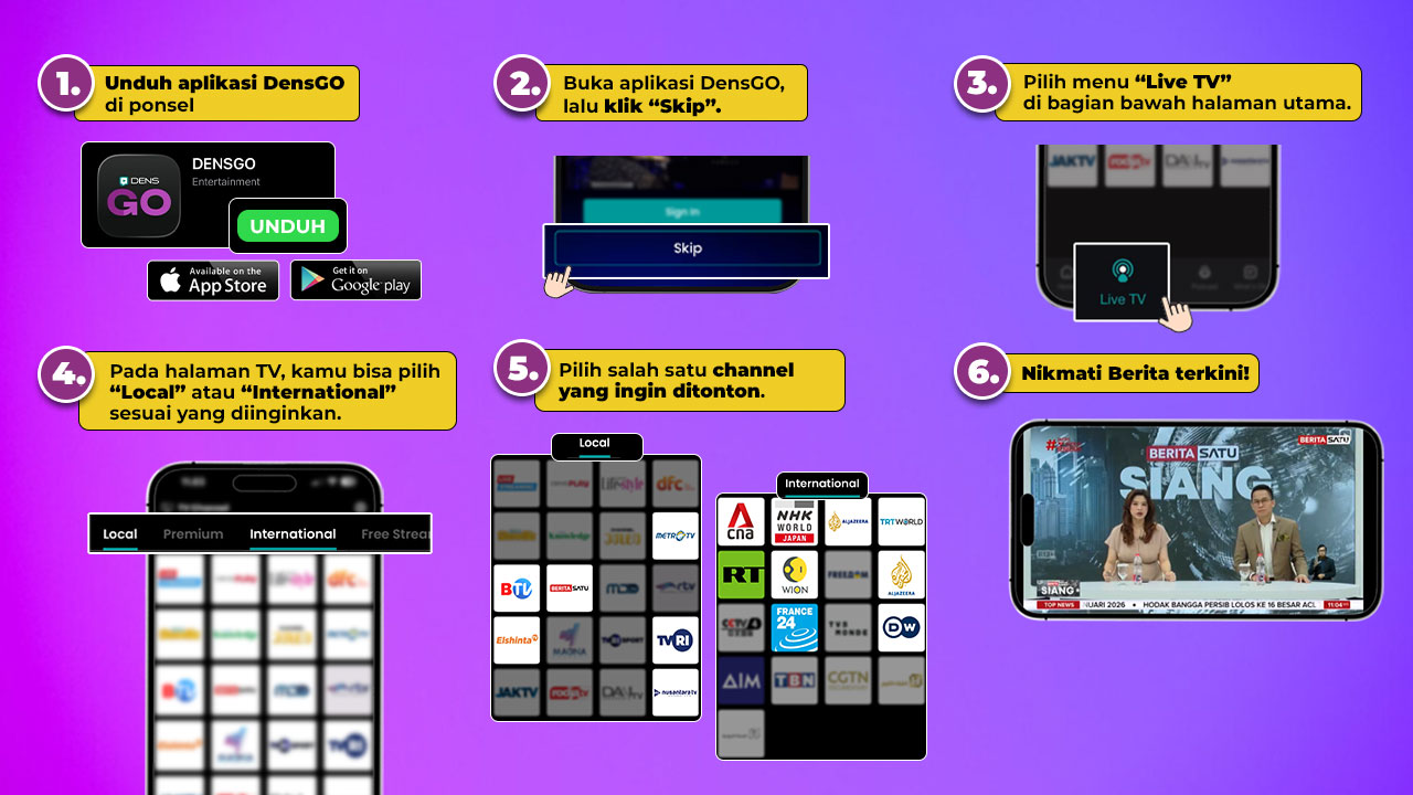Ada enam channel lokal untuk menyaksikan berita dalam negeri, yaitu Metro TV, BTV, Berita Satu, Elshinta TV, TVRI, dan Nusantara TV. Untuk menonton channel berita dalam negeri ini, kamu dapat mengakses DensGO yang tersedia di halaman “TV”, bagian “Local”.