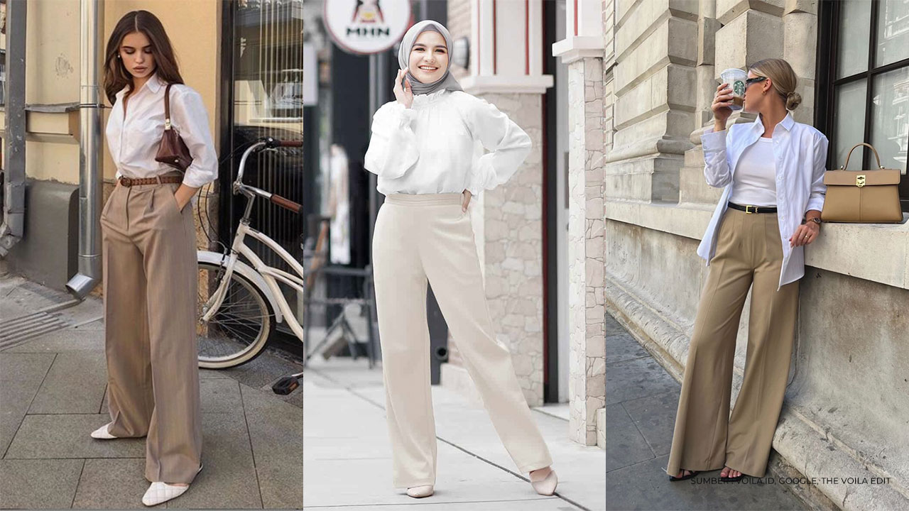 Untuk penampilan yang kalem dan tetap elegan, kamu bisa memadukan kemeja putih dengan high waist pants beige. Pada bagian lengan kemeja bisa digulung untuk memberi kesan yang lebih menarik.