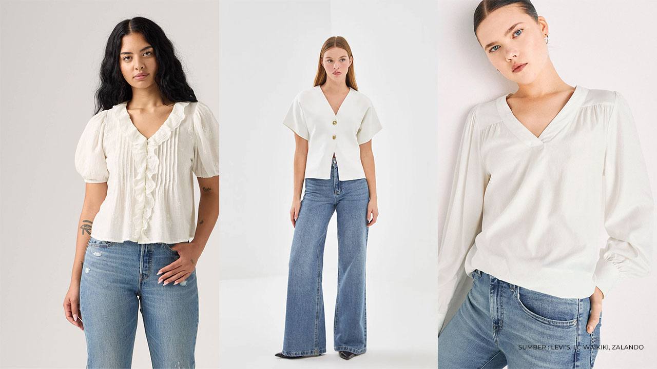 Kamu bisa memilih v-neck blouse putih dengan detail ruffle untuk memberi sentuhan elegan sekaligus feminin. Padukan dengan celana jeans model straight agar tampilan terlihat rapi dan seimbang.