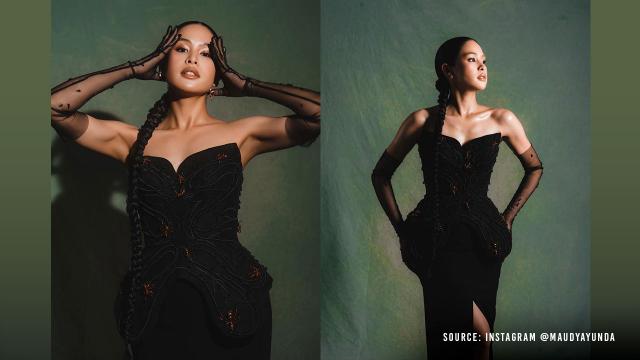 Maudy mengenakan tampilan serba hitam dengan atasan korset siluet kupu-kupu, dipadukan dengan rok panjang berbelahan tinggi berwarna hitam senada. Gaun tersebut dirancang oleh Hian Tjen dengan siluet strapless. Sekilas terlihat klasik, detail semut yang tersebar di permukaan gaun menciptakan kesan visual yang unik.